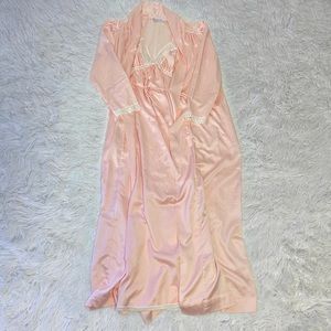 This breathtaking Christian Dior Slip Dress with its matching robe. With “Dior” Embroidery displayed throughout the set. Displays a beautiful white Lace design on the bust as well as the shoulders of the robe. Missing the white pink satin piece to tie the robe close, but can still be tied from the inside!
