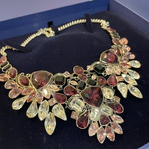 Vintage style with a fashion edge, this palladium-plated Swarovski necklace features an on-trend large bib silhouette. It sparkles in a seasonal palette of crystal colors that contrast beautifully with black epoxy details.