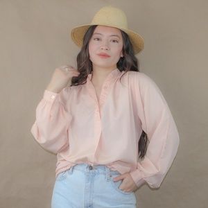 Classic and timeless vintage banded collar button down shirt in peachy polyester. Pairs perfectly with your favorite dark wash high waist jeans and boots or wear underneath a pair of denim overalls or pair with black slacks and loafers. Features ballon sleeves that meet at the cuff. The perfect 70s peasant blouse