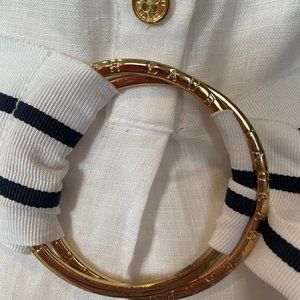 Crafted from lightweight linen, this quintessential summer dress pairs a buttoned top and a breezy A-line skirt with a blue and white striped belt.