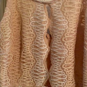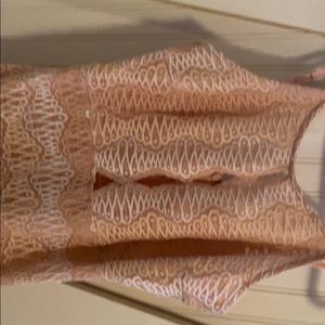 Storia little peach dress. Adjustable spaghetti straps. Zip back. Three key hole in front. Lace self of48% nylon 27% cotton 27% polyester. Lining is peach 100% polyester. Length measures 23” from armpit to hem . Bust 32”. Brand new with tags. Runs small