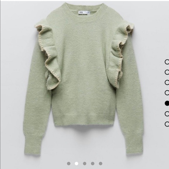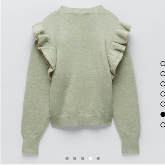 Sweater made with wool blend fabric with ruffled shoulders! Brand new with tags and in perfect condition. It’s the most beautiful sage green colour, very on trend. The material is so luxurious and warm! Can be worn casually with jeans or dressed up with a cute skirt!!