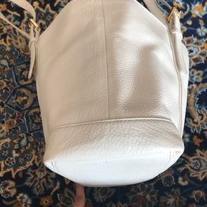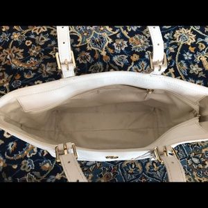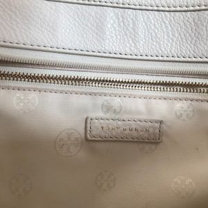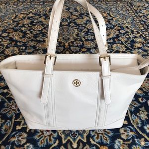 Beautiful ivory pebbled leather tote with gold accents. Lined with custom Tory Burch embossed fabric. Used but in great condition. Minor signs of wear on two corners