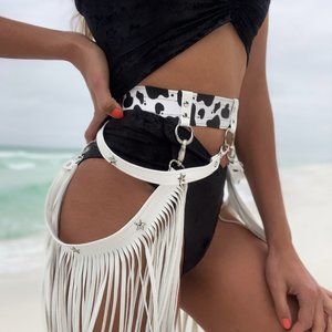 This festival outfit cow-print faux leather cowgirl belt is the perfect accessory for any music festival event or rave outfit!