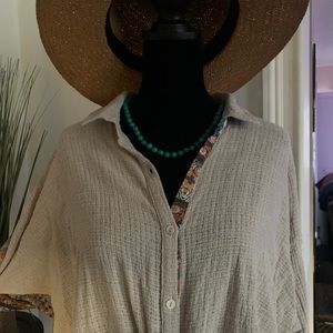 Very unique top- linen button up front with sheer sleeves and back. Can be tied as shown or tucked in- back is split down the middle. Wear a tank of any color under it to finish the look. Size M with a generous fit- will work for a Large too. Gently worn.