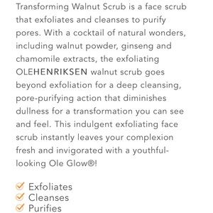 Ole Henriksen Transforming Walnut Facial Scrub. With walnut powder and ginseng extract. Full size (3 oz/85 g). Brand new and sealed. There is a weird imperfection on the back of the tube—doesn’t affect the product, but you can see in the pics that the plastic is slightly indented in a weird shape. Made in USA.
