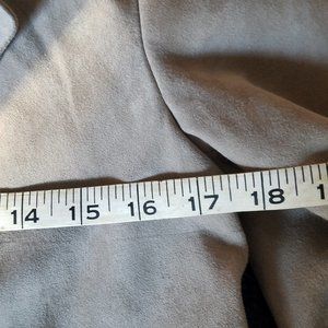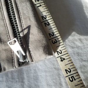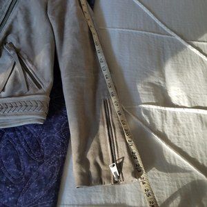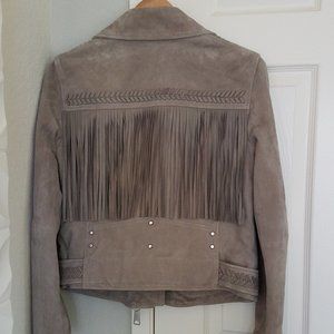 Brand new and unworn All Saints "Rosen" suede biker jacket with the coolest fringe in the back. US size 2, but definitely a bit oversized, (not as cropped and a bit longer sleeves, measurements shown) so could fit a 0-4 depending on how loose or fitted you like your look. Sold out everywhere. The perfect neutral shade of taupe to go with everything, and a touch of western feel without being over the top from the front (i.e., no sleeve fringe). Great with a long maxi dress and boots!