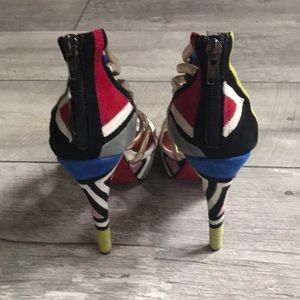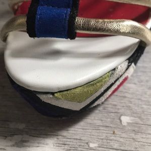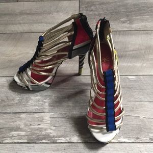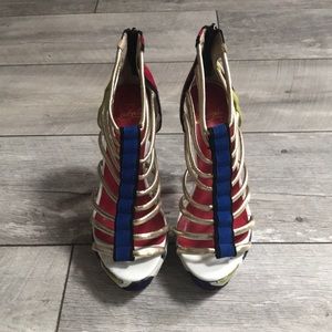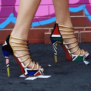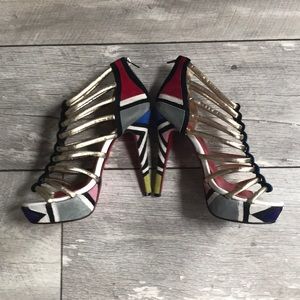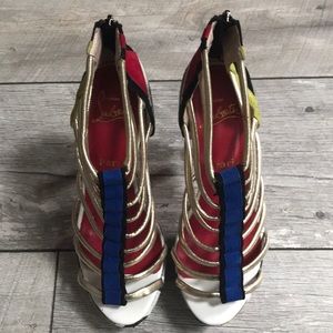 Christian Louboutin Ulona Inspired colourful print platform sandals with gold straps and zipper in the back