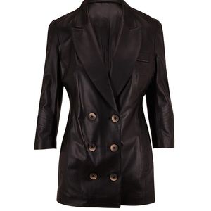 Zeynep Arçay's leather blazer is tailored in a double-breasted silhouette with three-quarter length sleeves.