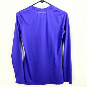 Women's Under Armour purple fitted workout shirt. Scoop neck. Long sleeved. Gently used, and in excellent condition; no rips, stains, fraying, or pilling.
