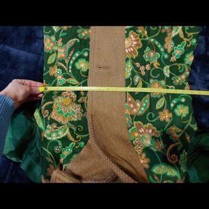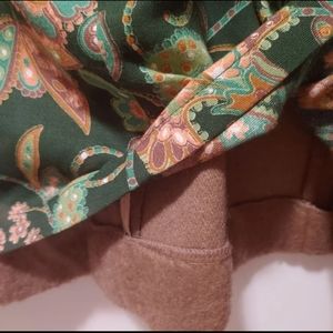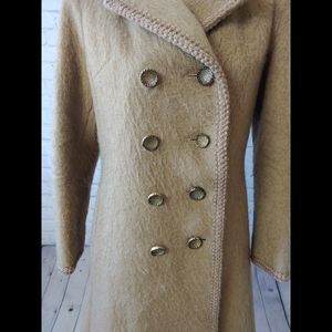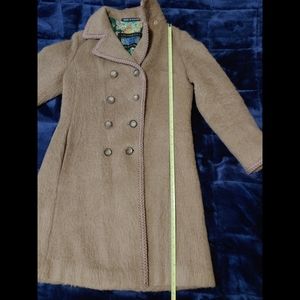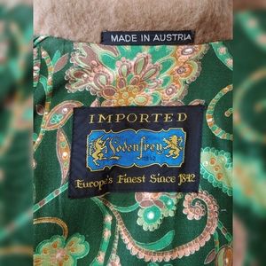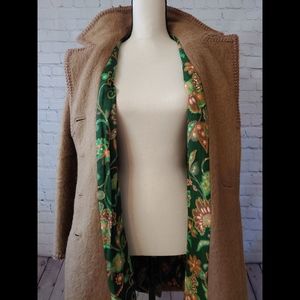 Women's size S 1970s vintage coat. Imported from Austria. Outer shell is wool and it is fully lined with fabulous green floral print. Excellent condition! Has double breasted rows of buttons on the front made of plastic and brass colored. Sleeves have cuffed wrists sewn to the liner that are hidden beneath the outer layer - makes it really easy to put on gloves and keep snow or cold from creeping up your sleeve! Fully functional side pockets. Crochet stitches on edges. So cool and chic!