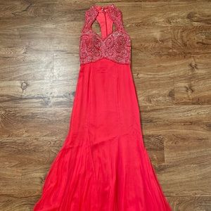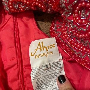 Alyce Designs Coral Beaded Pageant/Prom Gown. Size 6. Used with minimal (and fixable!) damage. See photos for rip along hem - multiple photos include for understanding of size. 51 inches from neckline/bust to hem.