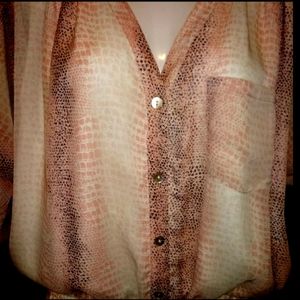 Kaya Di Koko Dress Size M Pink Snakeskin Print 1/2 button up Sheer Chiffon & Lined Ruched Smock Waist NWOT
