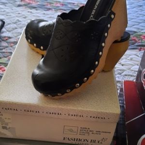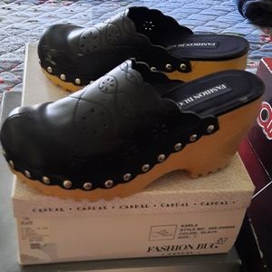 Black leather clogs, with nice wood platform