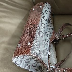 Guess handbag in good condition, large with 3 big sections one zipperred and 2 zippered pockets, one inside and one outside. Gorgeous patchwork pattern matches many styles! Holds and organizes many things! Good used condition.
