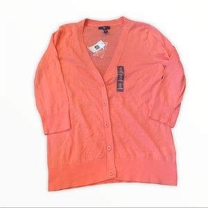 Beautiful knit v-neck cardigan in “Electric Cantaloupe”. This soft cardi features 5 front buttons, deep v neckline, wide ribbed bands at waist and cuffs. Fun color for the upcoming spring & summer. Brand new with tags. Size Small