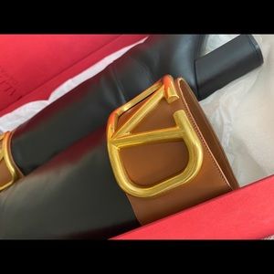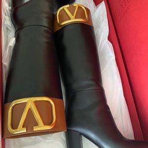 Size 7 (37) leather knee high Valentino boots, black with tan trim at the top and large gold “V” Valentino emblem on them. Gorgeous in person! Comes with box and dust bag and all original packaging, only worn once. Sold out everywhere! The tan/brown trim at the top matches the cognac Louis Vuitton brown perfectly, these shoes go with everything!