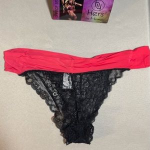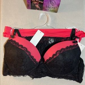 Hers by Herman Very Sexy Black Lace over Coral Red Push Up Padded Bra, Boy shorts, and Bikini Panties. 3 piece Set.