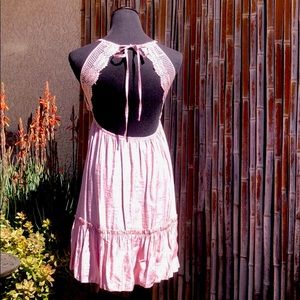 BRAND NEW Pink Cotton & Crochet Lace Open Back Ruffle Hem Halter Dress Sz Large