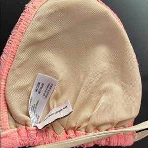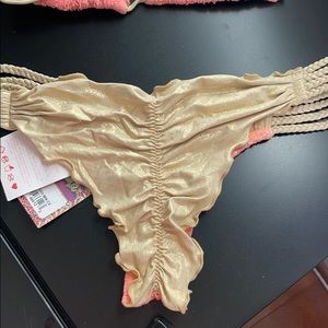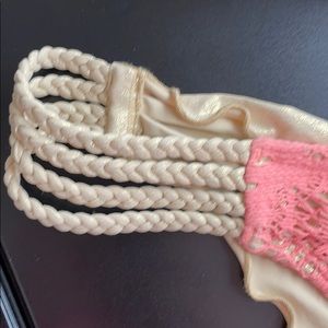 shimmer gold with pink crochet overlay. Braided details. Tag on top removed but never worn. Part of plastic tag still attached on top. Both pieces medium.