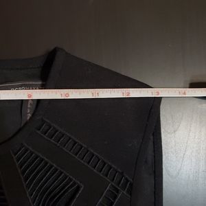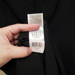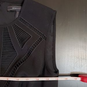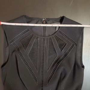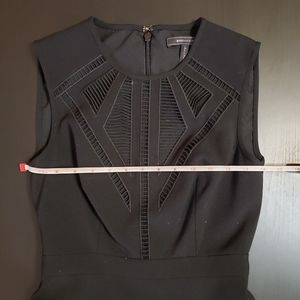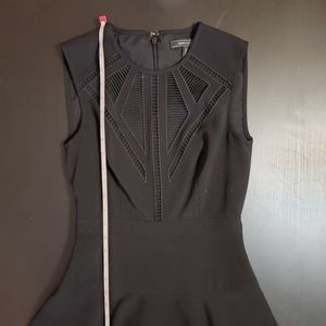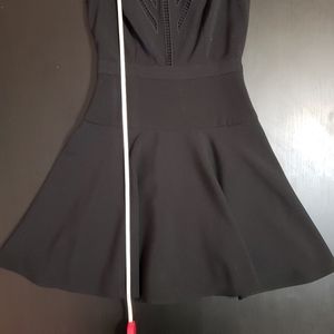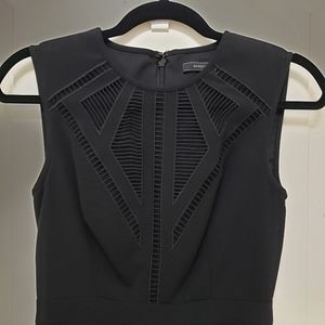 Black BCBGMaxAzria, "Aynn," embroidered sheer-trim dress in size 0. Fit-and-flare dress with alluring ladder-stitched front. Hidden zipper in the back and hook closure.