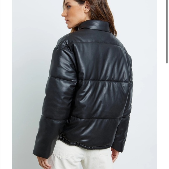 Vegan leather, long sleeve, lined, funnel neck, black puffer jacket featuring adjustable bungee cords at waist, boxy fit, woven channels for added warmth, and snap front closure. Stay cozy and warm in this sleek, structured puffer jacket.