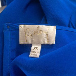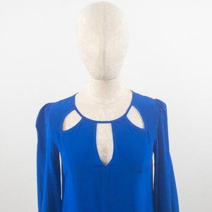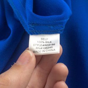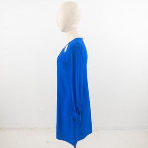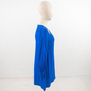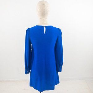 Beautiful blue silk dress w teardrop cutout neckline. Small puff shoulders & button cuffs. Relaxed fit - flowy. Clean w minor marks at under arm seams. GUC AS-IS.