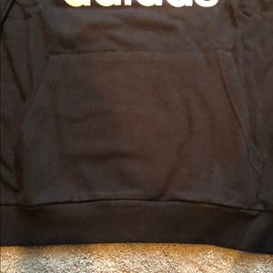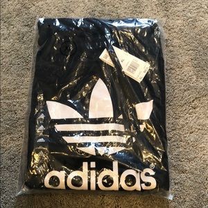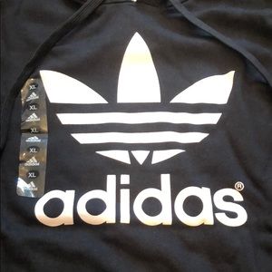 NWT Mens Adidas Black Trefoil Fleece Hoodie. Drawstring adjustable hood, front kangaroo pocket, ribbed sleeve cuffs, large adidas trefoil logo and lettering on center front, soft feel. Color is black. Opened for photo purposes only. Brand new with tags!!