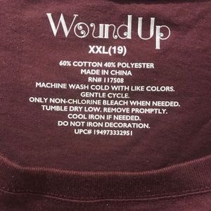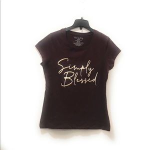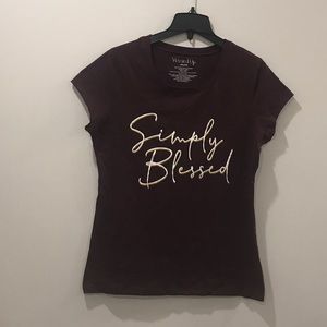This dark purple almost wines colored short sleeve tee has a round neck. The front says Simply Blessed in white and hold cursive lettering