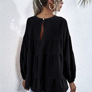 Decked out in some flirty ruffles takes this cute blouse and adds a edgy turn. Dress it up with some sleek jeans and boots for an unforgettable look.
