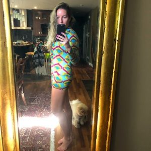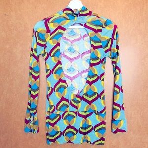 T-Bags Mini Dress with retro colorful design. Long sleeve turtle neck mini dress with open back gives a 70’s LA vibe.