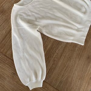 Free People women’s creamy white ribbed knit sweater. Size XS. Slouchy, oversized fit. Crewneck. Drop shoulders. Ribbed cuffs and hem. Measures 24” across the chest from armpit to armpit and 26” long. Rayon/polyester/nylon blend. In excellent condition!
