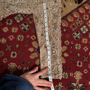 Gorgeous gold pakistani wedding dress. Only worn once (wedding day). Has very intricate work done on it and absolutely gorgeous. I’m 5’2 and with 4 inch heels this still gave me a beautiful trail. We all know how expensive wedding dresses from Pakistan/India have gotten. This I bought for about $3500 from Lahore and prices are increasing. Very difficult to find a wedding dress these days with this amount of work for less than $2000. DUPATTA NOT INCLUDED**