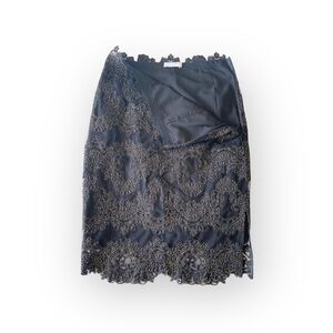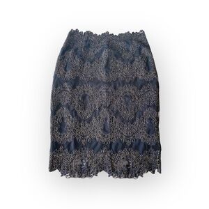 A chic pencil skirt features guipure lace in gold and a scalloped hems at waist and bottom hems. Concealed zip. Fully lined. Spectacular ❥