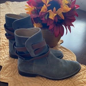 Olive green suede leather booty with brown buckle straps. They are missing little string tassels as shown in picture. Purchase these but do not fit.An excellent condition.