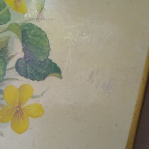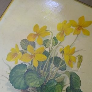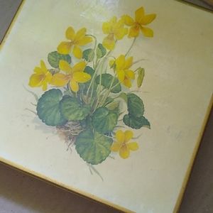 True vintage item made by Mottahedeh in Italy. The color on the lid is not capturing in the photos, it is a pale yellow background but in this photo it looks ivory. Flowers are like a yellow version of a violet. Hinges work. As it is true vintage there are scratches and imperfections. 8x8x2"