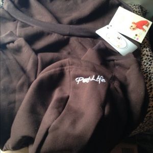 A brand new brown sweatshirt hoodie for a large dog. Sizing in pictures. Soft and cozy. Pet Life logo embroidered in white script on hood.
