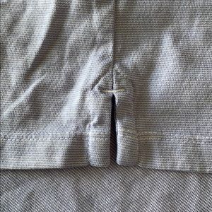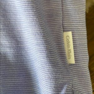 100% cotton super soft white lavender snd purple striped polo shirt. 2 button closure at collar, vented hem. Collar and sleeves have soft ribbed knit banding. Calvin Klein logo in silver on breast and tag on side seam. This is a very very nice casual shirt only worn once. Measurements (approx)