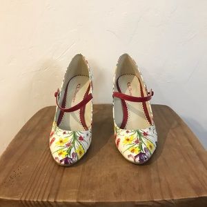 Floral and bug print 4" flirty Mary Jane heel. Rubber non-slip sole. Only worn two times.