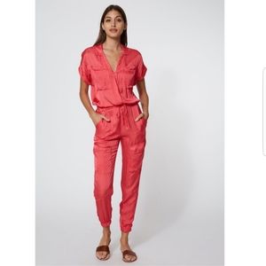 Beautiful orange silk like jumpsuit. 55% viscose and 45% Rayon. Multiple pockets. Size says small but runs a bit small. New Never been worn. This is perfect for the spring and summer. It's light weight and comfy.
