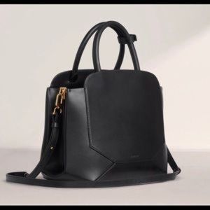 Sold out Bega satchel in black leather with gold hardware. Comes with long leather strap so you can wear as a crossbody or carry the handles and tuck the straps in for a polished look. Structured purse with soft black leather.
