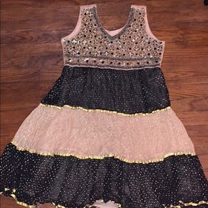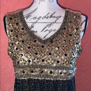 Truly OOAK! Handmade no tags. Features rayon feel lining and gold and black beading on bodice. Tiers of black and champagne fabric with gold metallic dots all over. Pull over styling no closure. EUC some loose threads in lining from handmade nature see photos. All measurements taken are approximate and subject to human error.