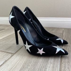 Yves Saint Laurent silver star black velvet pumps. Size 37.5 run true to size. Come with box and dust covers