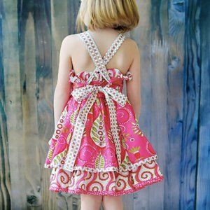 Colorful candy swirls, ruffled hems and flowing layers, plus polka-dotted shoulder straps w/ big bow at the back adorn this sassy little dress.