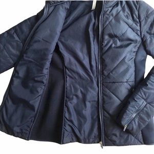 Cozy, cute, classy, & comfy puffer jacket by Kate Hudson’s Fabletics brand. Beautiful navy blue color with quality stitching. Zippered sleeves & pockets; all in working condition. There’s also a hidden hood zipped into the collar for added convenience! Side panels give this beautiful jacket a flattering, feminine shape. Excellent used condition; just 1 small snag barely noticeable (see last picture). Water resistant. Size small. Actual measurements: