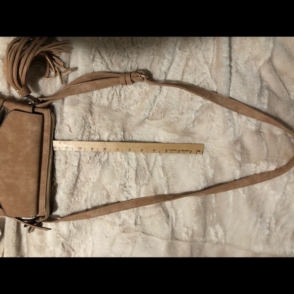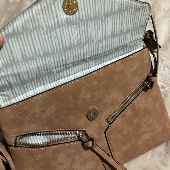 This is a super cute, faux suede crossbody bag. Used once. No outside marks. One tiny spot in the inside otherwise spotless and like new condition. See pics. Comes from a smoke free home. Fast shipping! Bundle & Save