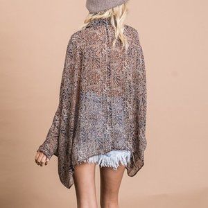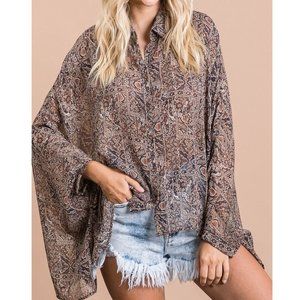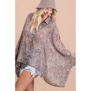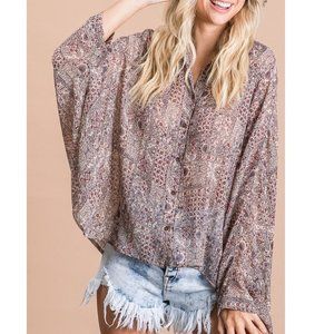This BoHo inspired Chiffon Sheer Oversized Boxy Button down Is absolutely adorable on. Great for so many occasions and all seasons. You can dress it up with a nice skirt or wear it with your cut off jean shorts. What an amazing addition to your wardrobe.