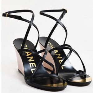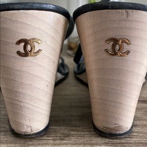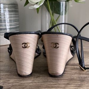 These were one of my favorite pair of summer shoes! You can tell from the amount of wear lol but they are still great and I am in no rush to sell 🙃.Wood wedge with CC logos. Leather straps buckle wrap around the ankle closure. Size 39.5 will fit a size 7.5-8