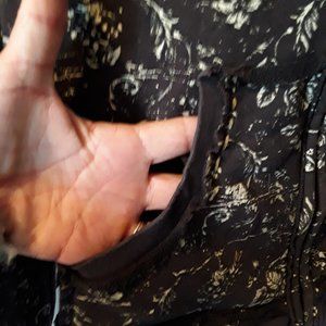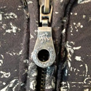 This is a great layering piece with lots of details including satin detail on shoulders and raw edge details. It is done in a coco brown with tan floral pattern. It is full zip with great Miss Me brazz pull. It is hooded with kangaroo pocket.