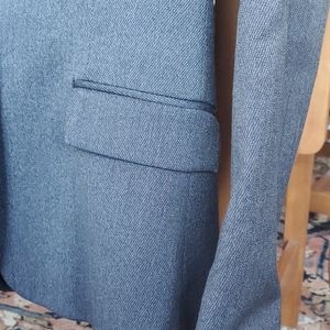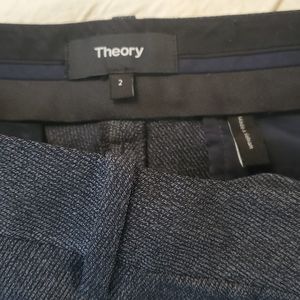 Blue/ black Theory suit: blazer & pant match. 87% virgin wool. Beautiful detailing om pockets. Top size 6, bottom size 2 (28 in waist, 32.5 inseam). Blazer: 18 in pit to pit, back collar to bottom 26in. Sleeve length: 17 inches pit to wrist.